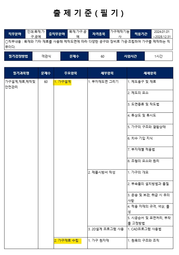 아래를 확인하시고 가구제작기능사 시험일정, 출제기준, 필기교재, 무료기출문제를 받아가시고 합격하시길 바랍니다